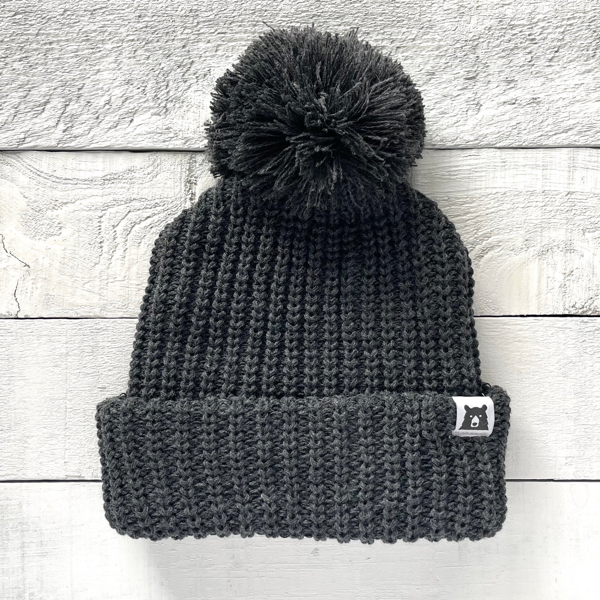 Our oversized, slightly slouchy toque, in a super chunky knit with our mascot bear label and large pom.